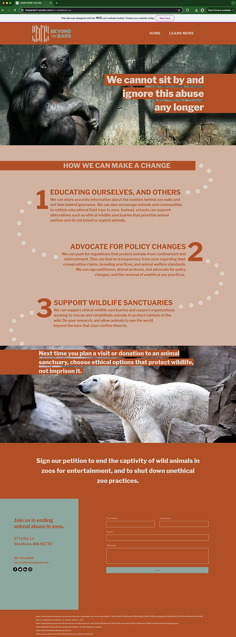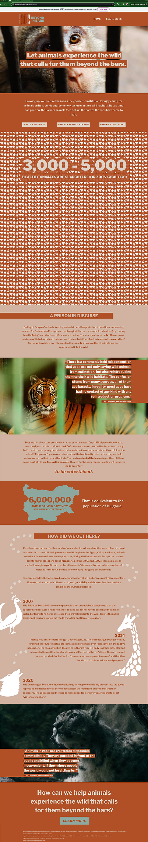 Beyond the Bars is a website and brand that I created in my Interactive Design class in Spring 2025 to address the abuse that happens behind the bars in zoos and unauthorized "wildlife sanctuaries."