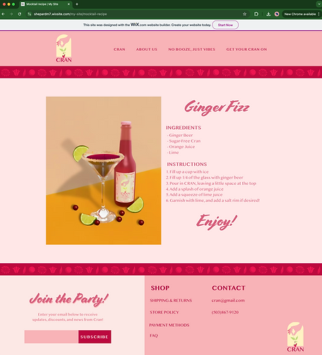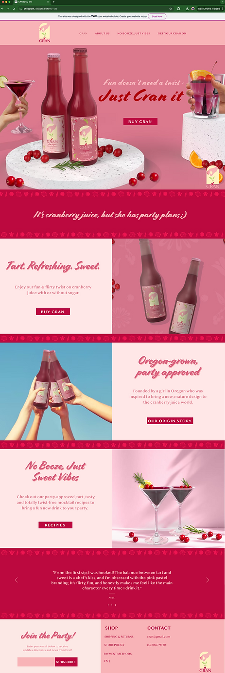 CRAN is a cranberry juice brand primarily targeting women between the ages of 18 and 35 who enjoy aesthetically pleasing design, hanging with friends on a Friday night or Sunday morning, and want to drink something tart and refreshing while not diving into alcohol. It originally began as an upscale cranberry juice, and I then added the aspect of the brand being an alternative to alcohol, including mocktail recipes on the website as well as the slogan, "Fun doesn't need a twist; Just Cran It."